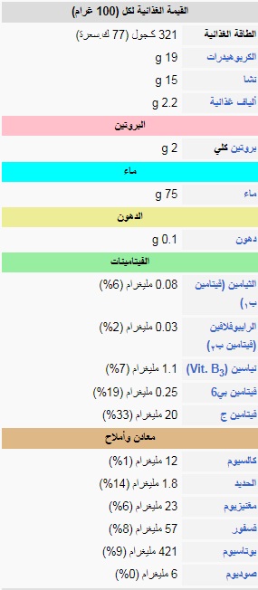 يحتوي كل 100 غرام من البطاطا المسلوقة (بحسب وزارة الزراعة الأميركية) على السعرات الحراية والمواد الغذائية التالية: