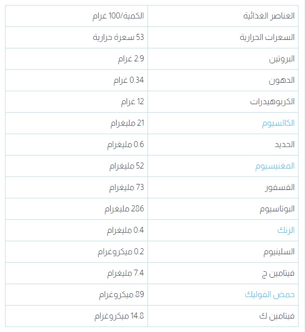 تأتي فوائد الخرشوف من القيمة الغذائية الوجودة فيه حيث يحتوي كل 100 غرام من الخرشوف على العناصر الغذائية الهامة المذكورة في الجدول الآتي: