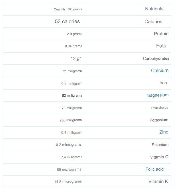 The benefits of artichoke come from its nutritional value, as every 100 grams of artichoke contains the important nutrients mentioned in the following table: