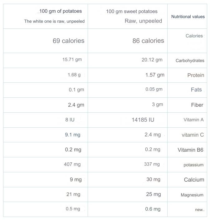 As for the difference between sweet potatoes and white potatoes from a nutritional standpoint, here is the following table that shows what every 100 grams contain, according to the USDA, for both