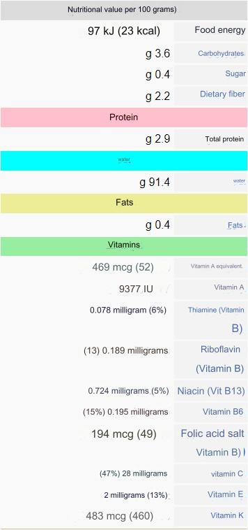 It has many benefits. It is included in salads and pies or eaten boiled. It also contains vitamins A, B, and K… As for its general composition, it is 92% water, 2.5% protein…. The caloric value is 22 calories per hundred grams. Spinach is beneficial for those with fevers, convalescents, sore throats, persistent colds, and chest diseases.